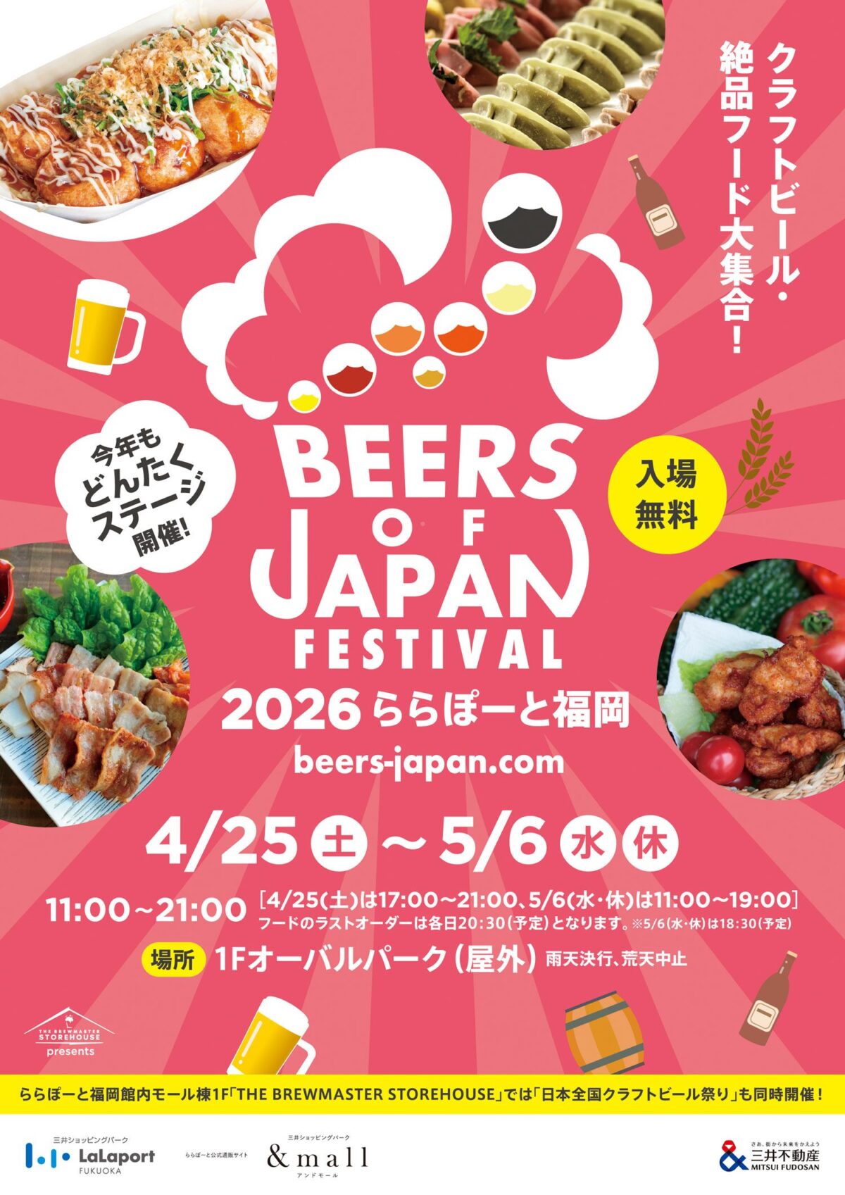 BEERS OF JAPAN FESTIVAL 2026は、福岡で4月に開催されるクラフトビールイベントとして、三井ショッピングパーク ららぽーと福岡 1F オーバルパーク(屋外)で、クラフトビールとフードが集まるイベントです。