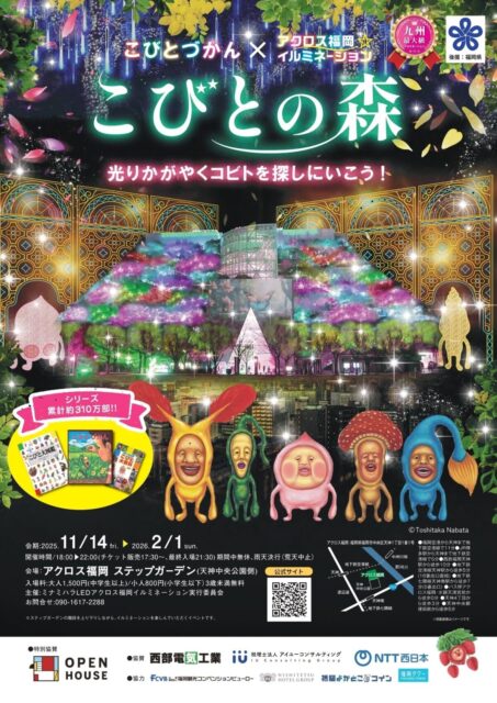 こびとづかん × アクロス福岡イルミネーション 2025『こびとの森』は、アクロス福岡のステップガーデンで開催される九州最大級のイルミネーションイベントで、光で形づくられたコビトたちが登場する幻想的な光の世界が広がります。巨大パネルが並ぶ屋上エリアや光の草原が輝くオーロラビジョンなど、物語の中を歩くようなスポットが多数用意されています。こびとさがしに参加するとオリジナルステッカーがもらえる企画もあり、家族で楽しめる内容です。